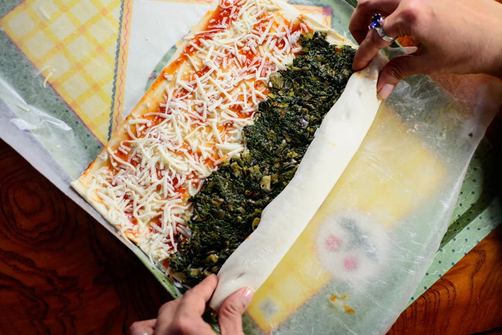 - Spread the spinach mixture on ¾ or a little more than ½ the sheet from the right side to the center.